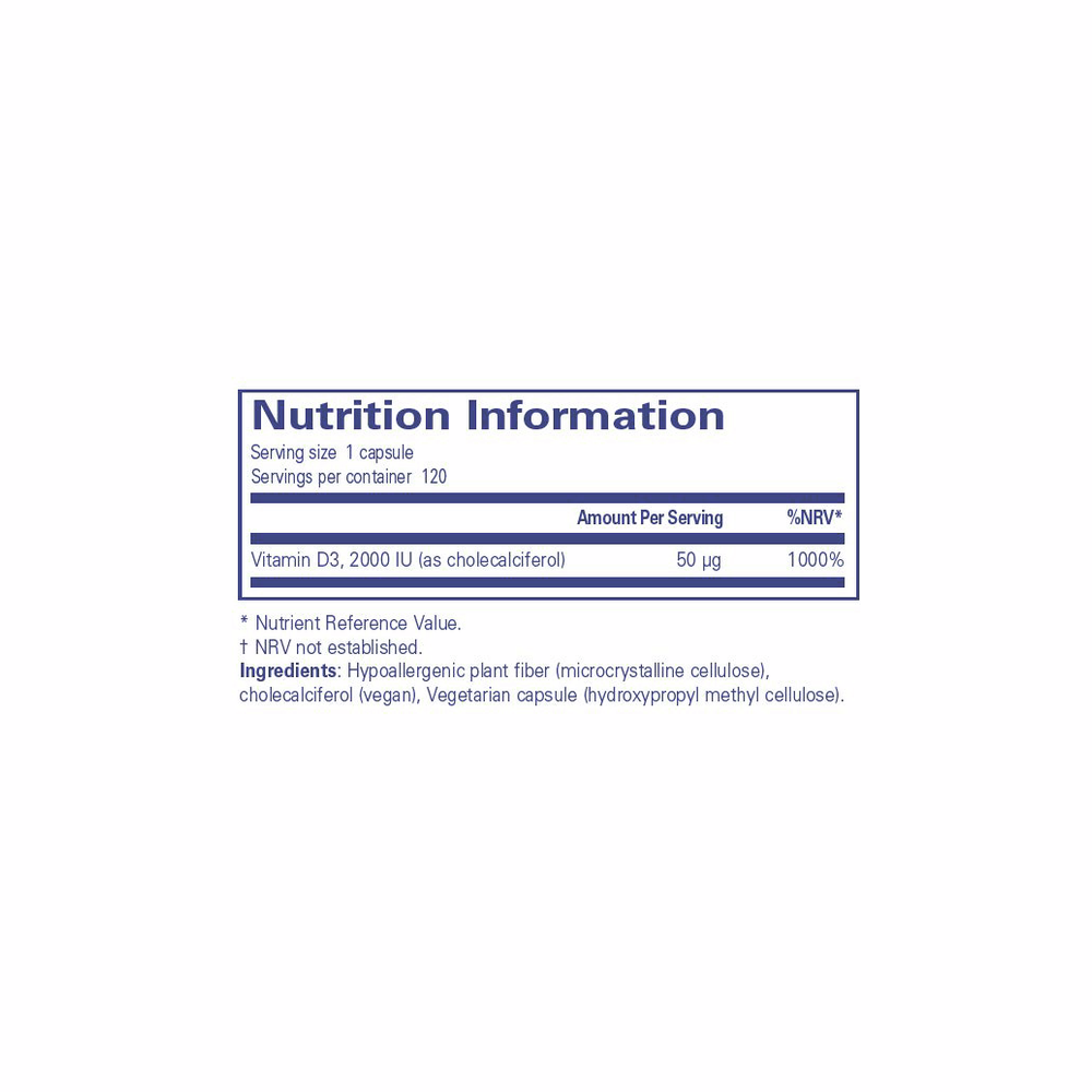 Vitamin D3 (vegan) 2000 IU (50 ug) provides pure vitamin D as D3, the preferred form of vitamin D. Vitamin D contributes to the maintenance of normal muscle function and normal bones. Vitamin D also contributes to the normal function of the immune system.