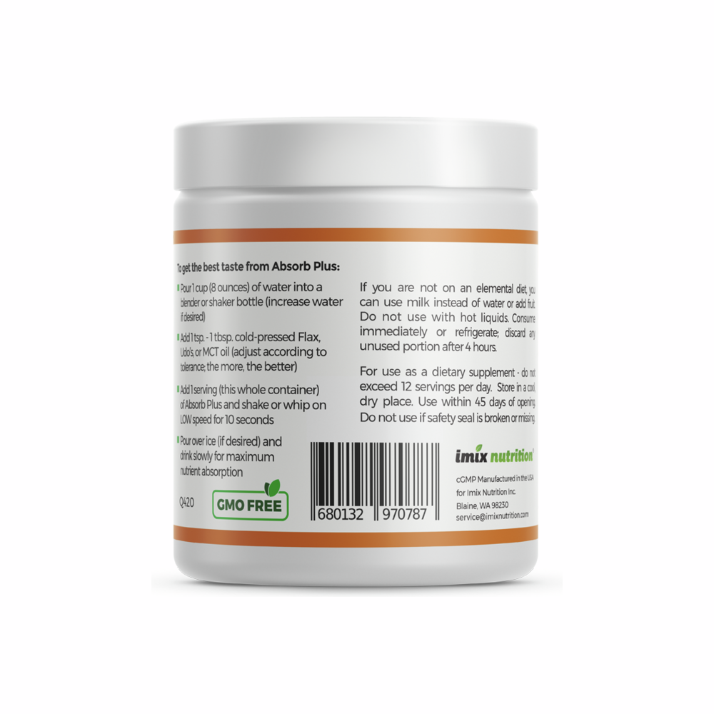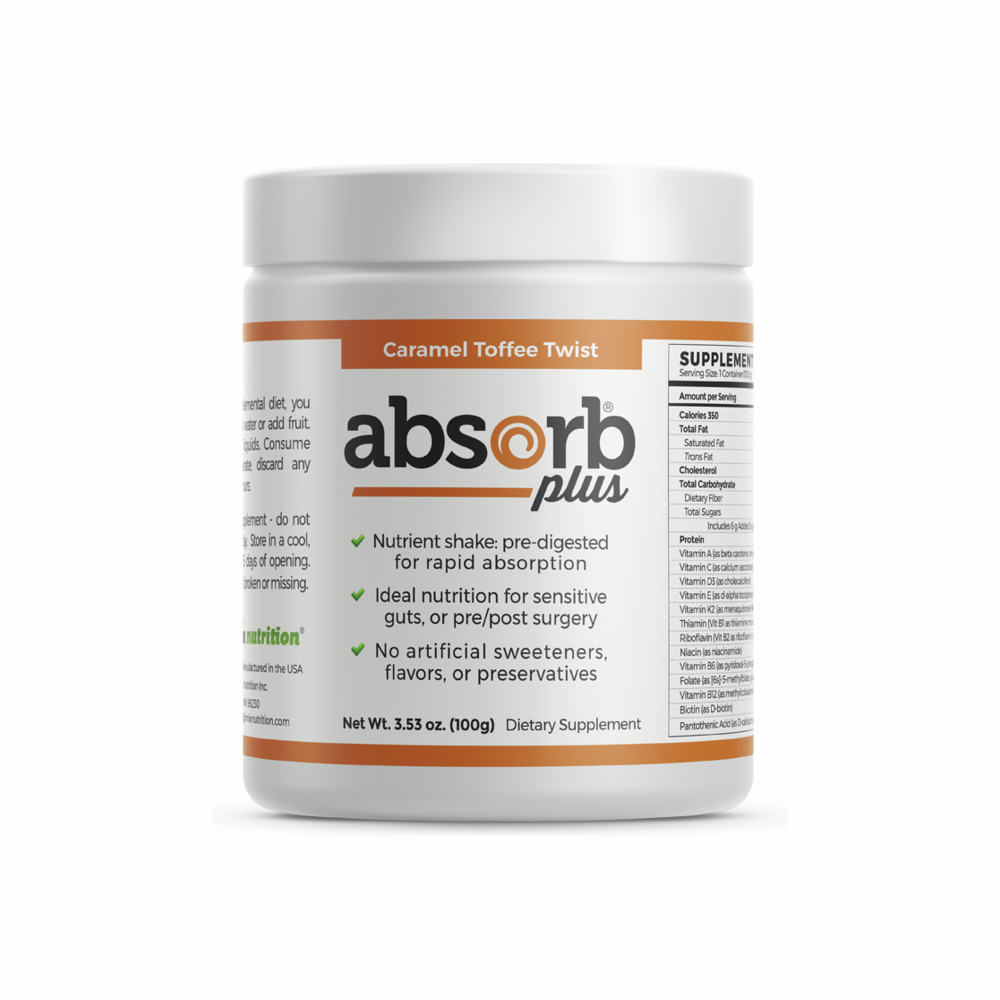 May be used exclusively as part of an elemental diet (reduced faecal matter), or along with other foods to provide a low residue diet, or to provide high-quality nutrients in liquid form. Absorb Plus has been carefully formulated to meet the unique needs of people who have problems chewing, swallowing, digesting or absorbing their food. There is currently NO product on the market that matches Absorb Plus in nutritional value or the extremely high quality of our ingredients.