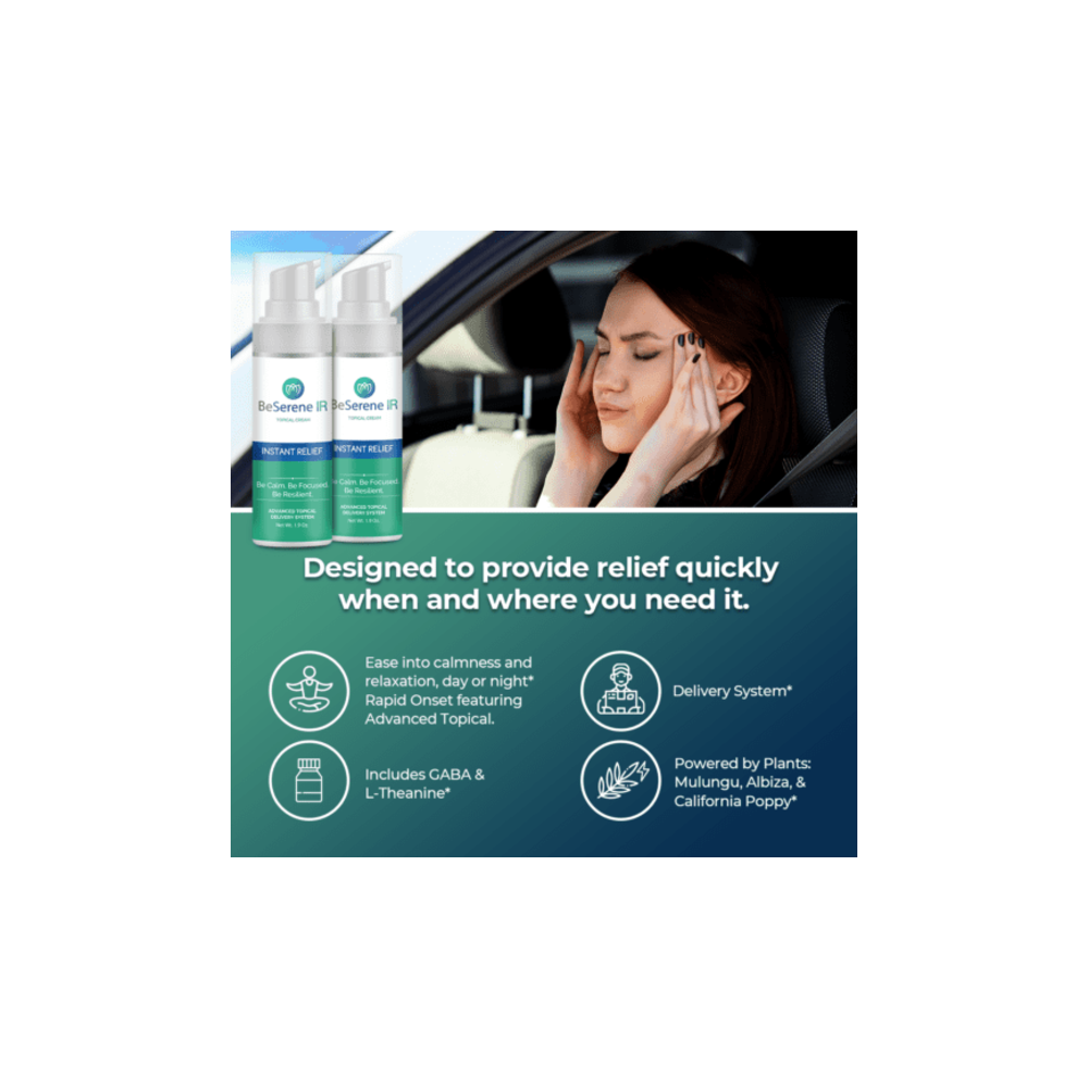 BeSerene Instant Relief Cream has an advanced topical delivery system designed to work fast, in under 10 minutes for most people, by naturally absorbing through the skin. Apply 1-2 pumps to wrists or temples every 1-2 hours, as needed to feel relief in minutes.