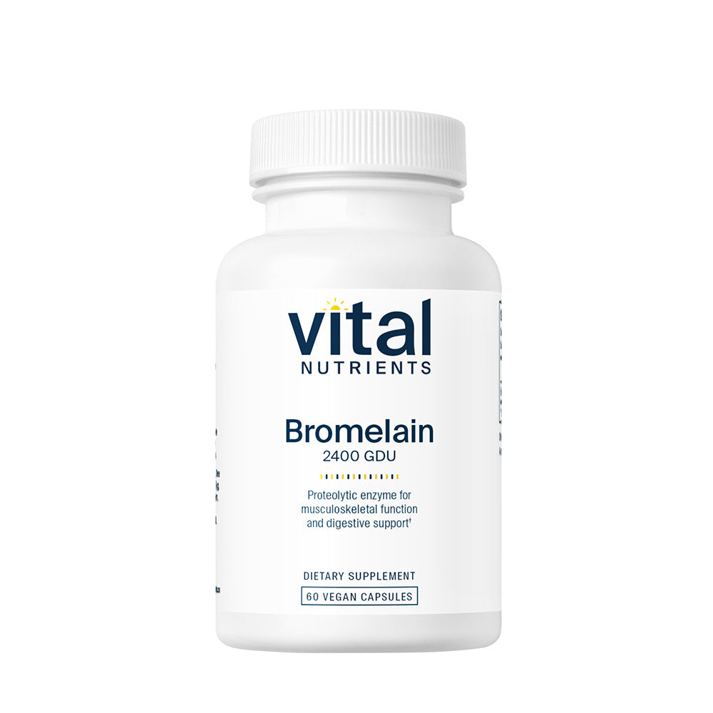 When taken between meals, Bromelain helps support the body's physiologic levels of kinins and fibrins, promoting healthy capillary blood flow to facilitate delivery of nutrients and removal of inflammatory waste products. Bromelain is particularly useful for individuals interested in promoting normal sinus, tissue, and musculoskeletal health.