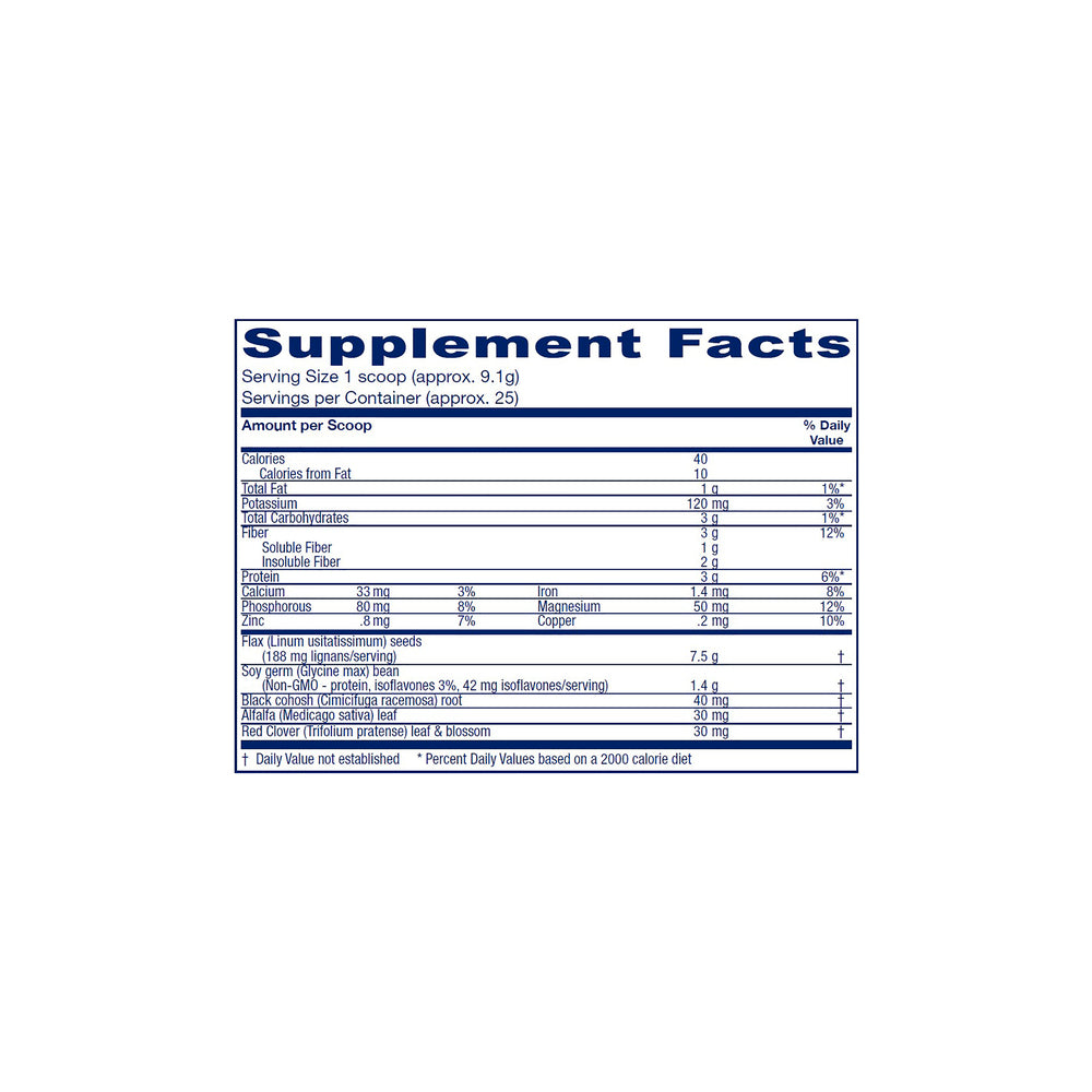 This progressive powdered formula offers a phytoestrogen-rich blend of botanicals and non-GMO soy isoflavones and flaxseed lignans; Supports all stages of menopause, promoting the many health-promoting benefits of a high dietary intake of phytoestrogens, including bone, heart, breast health, and more.*