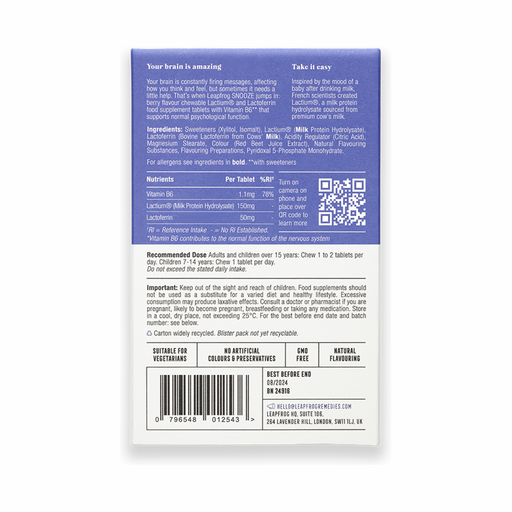 Leapfrog SNOOZE chewable tablets support the nervous system with Lactium® & Lactoferrin (sourced from cow’s milk) & Vitamin C.