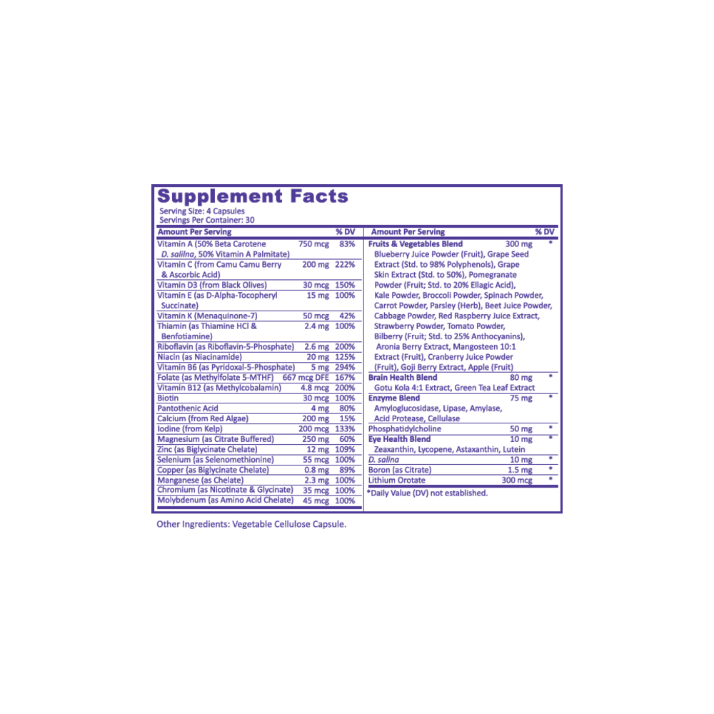 The capsules contain essential vitamins and minerals to optimize the health of both mind and body, including Calcium, Vitamin A, Vitamin E, Vitamin K, Vitamin B12 and beyond for better nutrition."